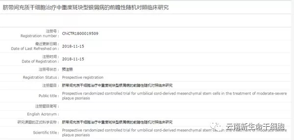 2018年11月,同濟(jì)大學(xué)附屬第十人民醫(yī)院在中國(guó)臨床試驗(yàn)注冊(cè)中心注冊(cè)了一項(xiàng)臍帶間充質(zhì)干細(xì)胞治療中重度斑塊型銀屑病的前瞻性隨機(jī)對(duì)照臨床研究 ,評(píng)價(jià)臍帶間充質(zhì)干細(xì)胞治療中重度斑塊型銀屑病的有效性和安全性,同時(shí)篩選出臍帶間充質(zhì)干細(xì)胞治療中重度斑塊型銀屑病的最佳劑量,為臨床應(yīng)用臍帶間充質(zhì)干細(xì)胞治療中重度斑塊型銀屑病提供必要的理論依據(jù),為銀屑病的治療指南或?qū)<夜沧R(shí)的制定提供循證醫(yī)學(xué)證據(jù)。