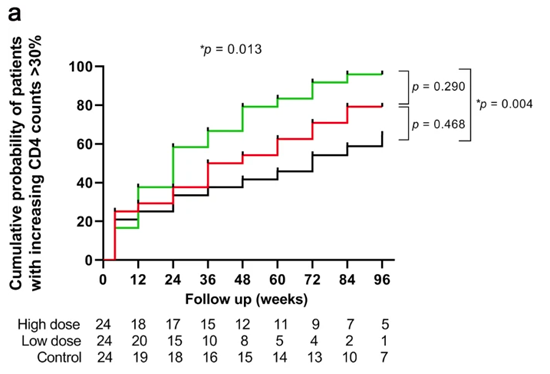 * 低劑量組優(yōu)于高劑量組,至少部分改善了患者的免疫重建