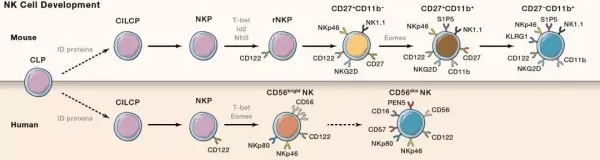 在小鼠中,共同淋巴樣祖細(xì)胞產(chǎn)生共同ILC前體(Common ILC precursor, CILCP)。而CILCP可產(chǎn)生NK細(xì)胞、輔助樣ILCs。從CILCP開始,機(jī)體內(nèi)的NK細(xì)胞發(fā)育至少包括五個(gè)階段才可產(chǎn)生NK細(xì)胞,即: