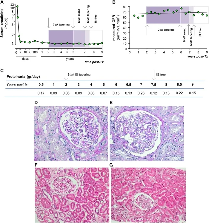 輸注BM來(lái)源的MSC后,患者在移植后迅速恢復(fù)了正常的腎功能,此后經(jīng)歷了簡(jiǎn)單的臨床過(guò)程,并在接下來(lái)的2年中穩(wěn)定了移植功能。移植后1年,監(jiān)測(cè)方案活檢未顯示亞臨床排斥反應(yīng)的證據(jù)。同時(shí)血液檢測(cè)結(jié)果顯示,患者對(duì)供體腎臟產(chǎn)生了耐受性?;颊咚玫拿庖咭种苿┲饾u減少,直到完全停止服用。