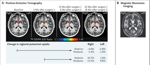 2020年,《新英格蘭醫(yī)學(xué)雜志》報道的案例移植了患者自體誘導(dǎo)多能干細胞(iPSC)衍生的多巴胺能前體細胞。移植部位為左半球和右半球的殼核,總共2次移植,時間間隔為6個月,每次移植劑量為400萬個細胞。影像學(xué)檢查表明,兩個iPSC來源的移植物已經(jīng)遞送至靶標的殼核位置,并穩(wěn)定的存活在患者體內(nèi)。