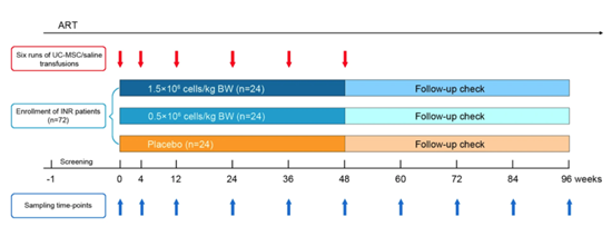 因此,王福生院士團(tuán)隊(duì)進(jìn)一步開展了一項(xiàng)多中心、隨機(jī)、雙盲、安慰劑對(duì)照、劑量確定的II期臨床試驗(yàn)。該研究使用臍帶間充質(zhì)干細(xì)胞輸注治療,評(píng)估了免疫重建不良的艾滋病患者體內(nèi)CD4+細(xì)胞計(jì)數(shù)的變化。