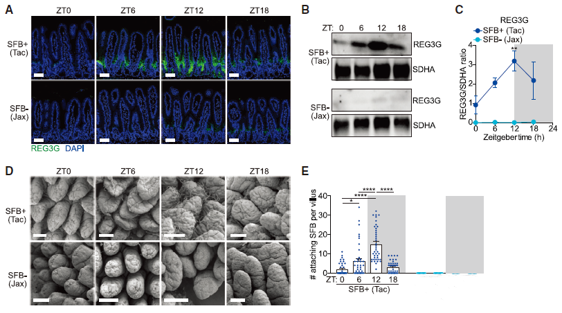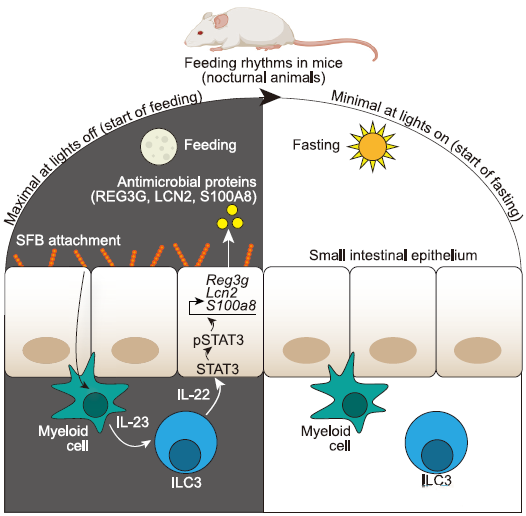 他們通過小鼠實驗發(fā)現(xiàn)腸道菌群和生物鐘協(xié)同產(chǎn)生了腸道先天免疫的晝夜節(jié)律。具體而言,小鼠的進食行為促進了腸道分段絲狀菌(SFB)節(jié)律性地附著于腸上皮,并驅動上皮細胞信號傳導和轉錄激活因子3(STAT3)的表達和激活振蕩,從而產(chǎn)生了一種被稱為再生胰島衍生蛋白3γ(REG3G)的抗菌分子在夜間的含量更高(此時為夜行性動物的活躍狀態(tài));而在白天睡眠時含量較少。但在無菌小鼠體內,無論白天還是晚上,REG3G基本上都不存在。