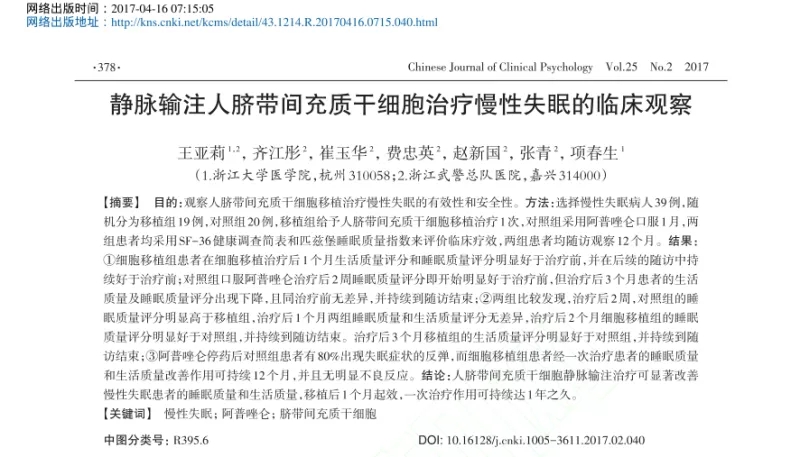 2017年,發(fā)表在《中國臨床心理學》雜志的一項臨床觀察成果顯示,靜脈輸注臍帶間充質干細胞可長期改善慢性失眠患者的睡眠質量。